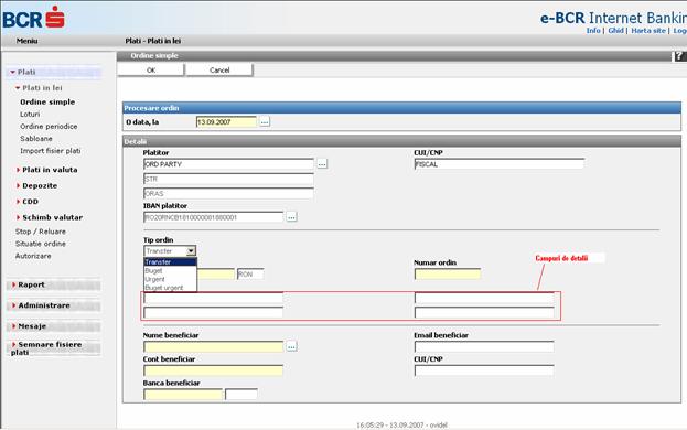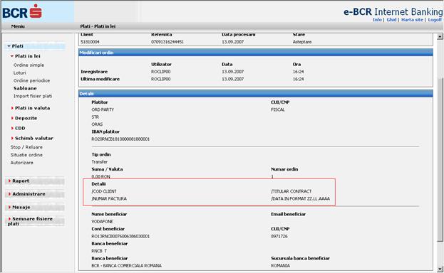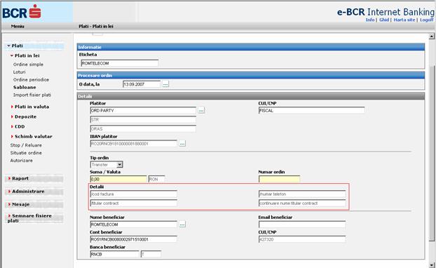 In cimpul de Detalii aveti la dispozitie 4 cimpuri de cite 35 de caractere pentru introducerea detaliilor platii.