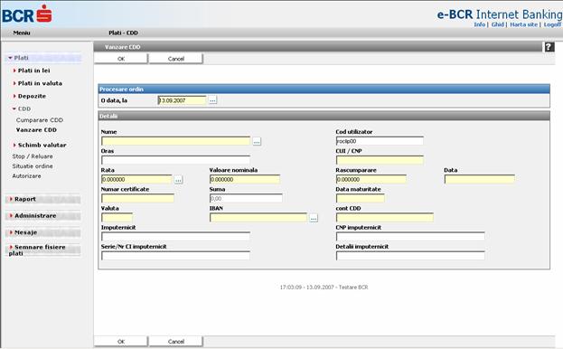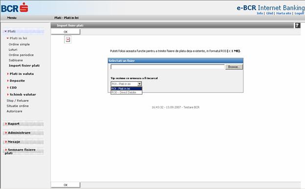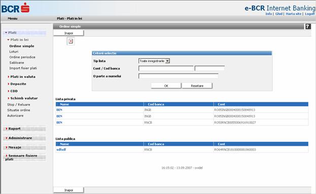 Se pastreaza procedura descrisa la Ordine simple, in Lei, cu mentiunea ca pentru alimentare carduri BCR proprii se alege: