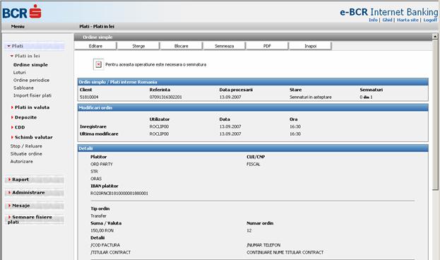 Clientul are posibilitatea de a stabili drepturi de acces si utilizare pentru fiecare utilizator inscris in Anexa 1a la Conventia de e-BCR/e-BCR+. Totodata, se pot definii: numarul de semnaturi necesare pe un ordin de plata (ROI, INT), tipul de semnaturi pentru fiecare sesiune in parte (ROI, INT, 11111j922l CDD, TDI, DDS, etc.) si drepturi de acces si operare pe conturi. Pentru transmiterea unor ordine: CDD, TDI sau Schimburi valutare (DDS) este necesara o singura semnatura de tip E.
