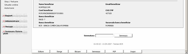 Se vizualizeaza acele operatiuni introduse prin Multicash care asteapta a doua semnatura. Se semneaza in bloc toate operatiunile din fisierul trimis la banca prin Multicash.
