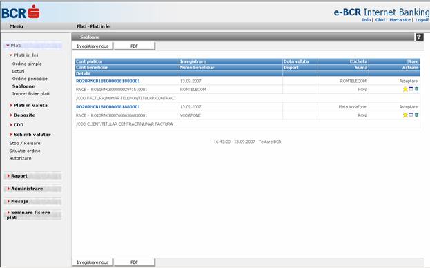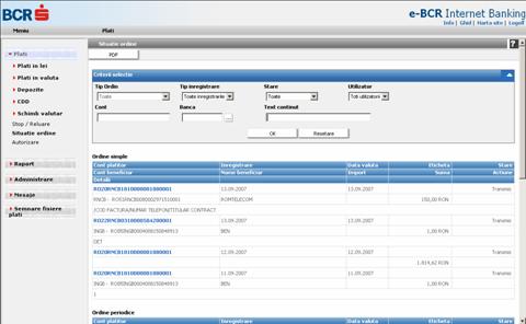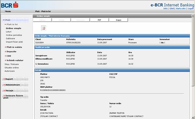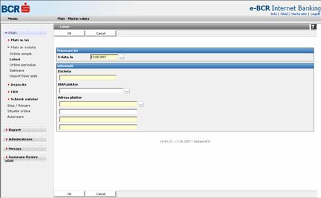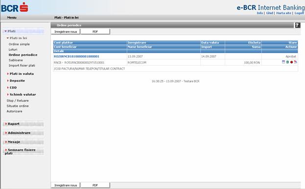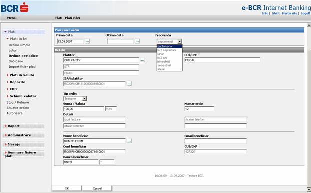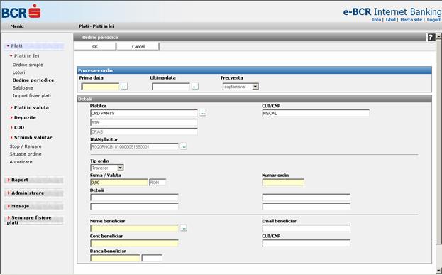 Ordin periodic*)= ordin de plata care se genereaza si se semneaza o singura data, se pastreaza pe serverul bancii si se transmite automat la unitatea bancara pentru procesare conform perioadei de valabilitate si a periodicitatii stabilite de dvs. Se pot modifica oricind sau se pot sterge.