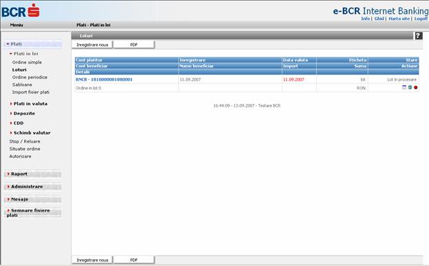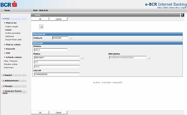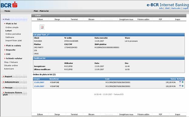 Lot*)= mai multe Ordine de plata, care sint introduse in timp, pentru a fi semnate o singura data si transmise grupat la banca.