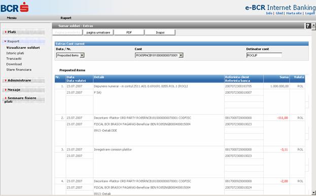 Prin apasarea butonului "pagina urmatoare" se pot vizualiza pana la final operatiunile zilnice efectuate, precum si soldurile finale disponibile.