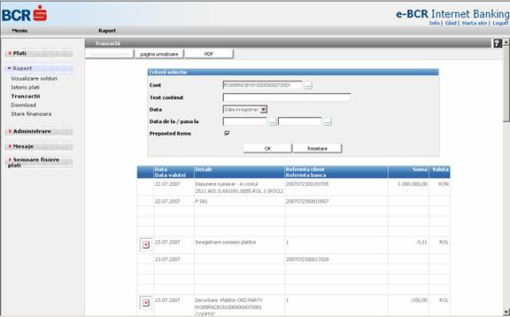 Se pot face diferite selectii pentru cont, perioada si data emiterii.