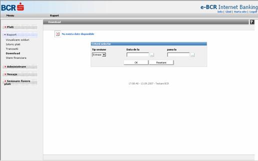 Extrasele de cont primite de la banca pot fi descarcate pe calculatorul personal. Puteti selecta tipul de sesiune si/sau perioada pentru care doriti sa vizualizati extrasele:
