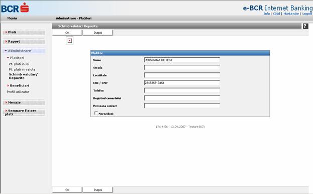 Se selecteaza numele definit in meniul : Administrare - Platitori - Schimb valutar depozite.