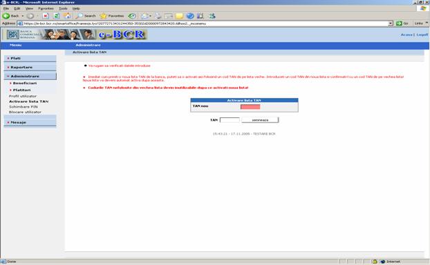 3. Acces la aplicatie se face prin parola (PIN) iar semnare operatiunilor se face cu coduri dintr-o lista de 50 de coduri TAN, generata de banca. La epuizarea primelor 40 de coduri banca genereaza automat o noua Lista de 50 de coduri TAN, care se expediaza clientului.