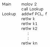 Tabelul poate fi format ca un subprogram ce consta dintr-o serie de instructiuni 'RETLW k', unde constantele 'k' sunt membri ai tabelului.