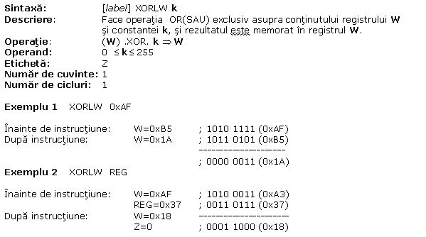 A.15 XORLW W OR(SAU) logic exclusiv cu o
