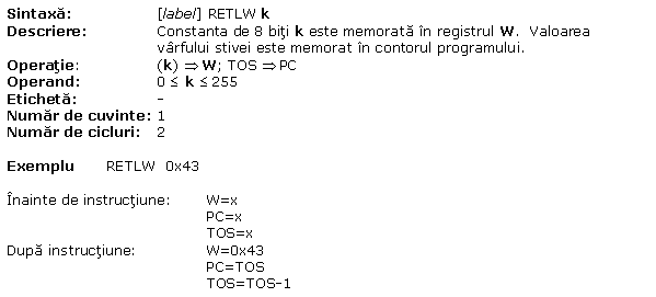 A.31 RETLW Intoarcere dintr-un subprogram cu constanta in W