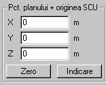 Aceasta functie deschide o caseta de dialog în panoul din partea stânga a ecranului programului FEAT'98. În câmpurile de introducere din sectiunea numita Pct. planului trebuie introduse valorile X = 0, Y = 0, Z = 0. Acest punct defineste pozitia planului de lucru în spatiul 3D.