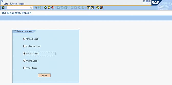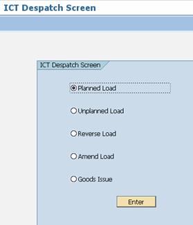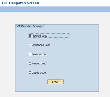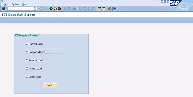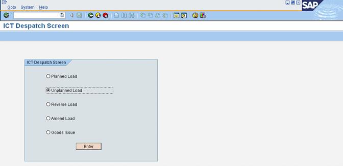 Introduceti tranzactia "Z2ICT" ptr a activa despatch front end. Selectati butonul radio "Unplanned Load" si apasati Enter.