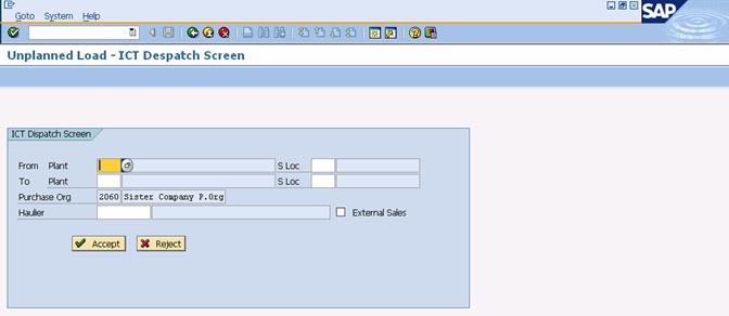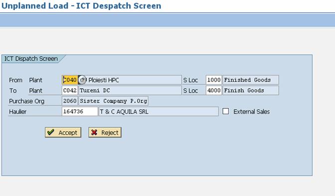 Este afisat ecranul "Unplanned Load - ICT Despatch Screen". Bifati "External Sales" check box.