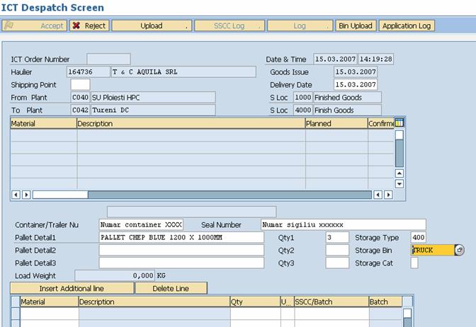 Ecranul "ICT Despatch Screen" este afisat. Introduceti: container / trailer number, pallet details, seal number (not mandatory), quantity, storage type si storage bin. Odata ce toate aceste campuri sunt populate, click pe butonul "Bin Upload localizat in partea dreapta -sus a ecranului.