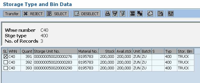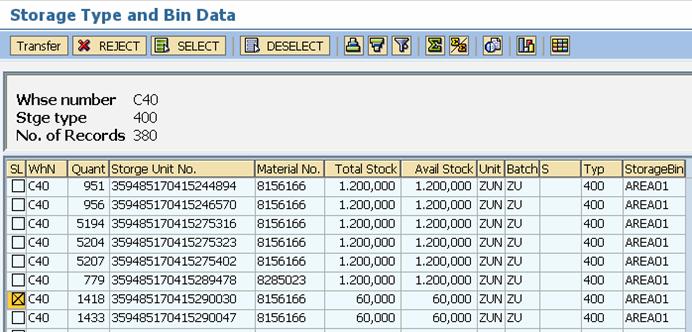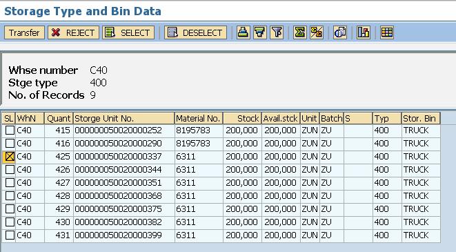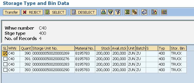 Ecranul "Storage Type and Bin Data" este afisat. Selectati paletul care trebuie picked si dati clic pe butonul "Transfer" .