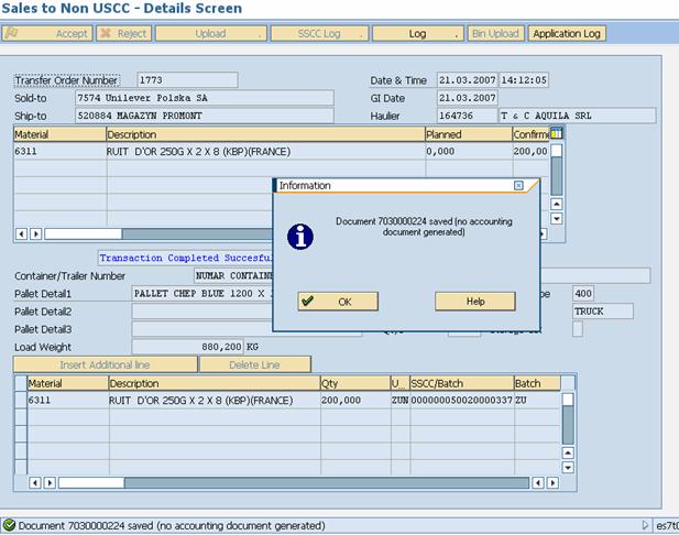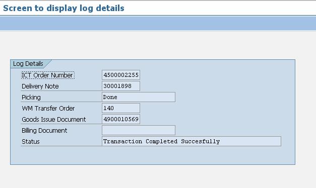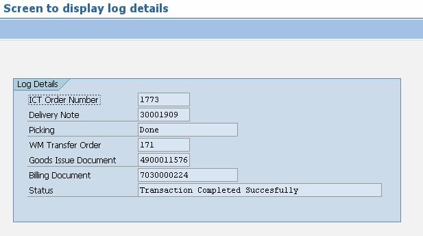 Click pe butonul"Log" ptr a afisa ecranul "Screen to display log details". Acest ecran arata stausul documentului creat . Notati numarul ptr delivery .