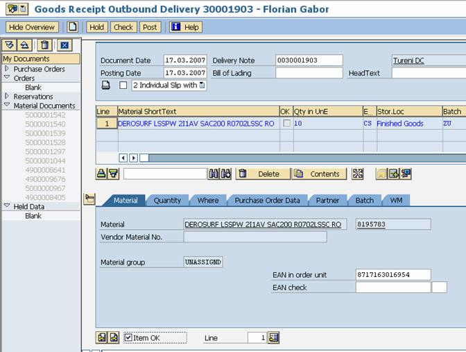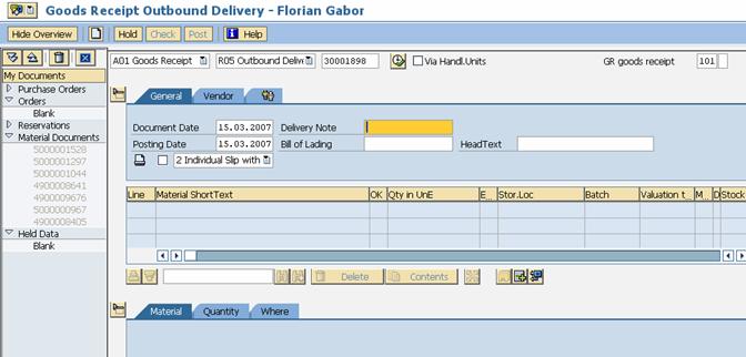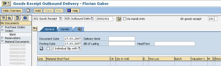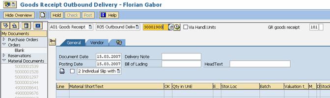 Selectati "A01 Goods Receipt" si"R05 Outbound Delivery . Introduceti numarul ptr delivery si verificati daca movement type este 101.
