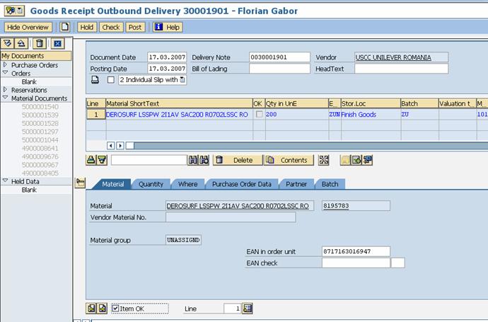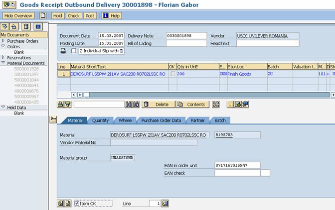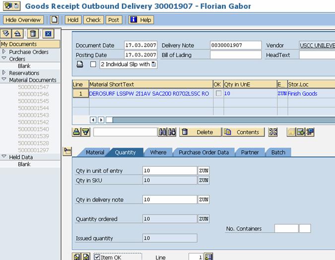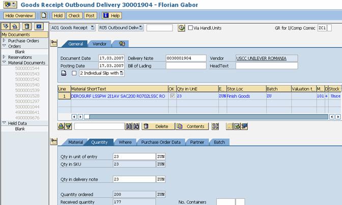 Detaliile ptr order sunt afisate. Verificati daca cantitatea primita este corecta (quantity tab). Ptr a confirma primirea materialului , verificati prin apasarea "OK" flag. Click pe butonul "Post' botton ptr a inregsitra Goods Receipt.