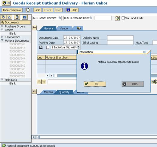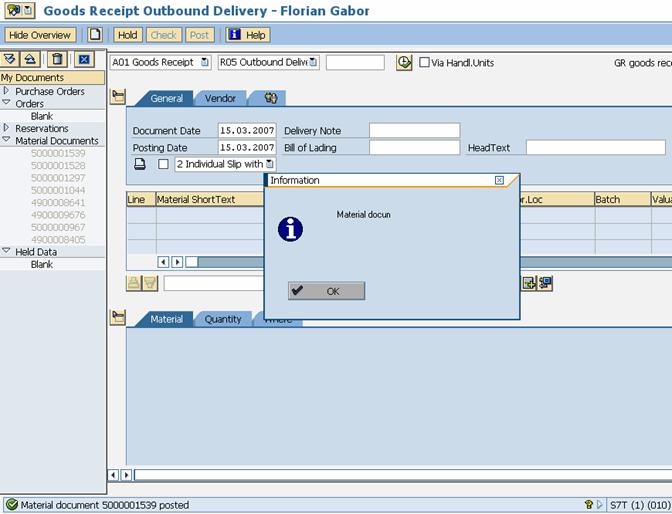 Un mesaj ce indica faptul ca Goods Receipt a fost inregsitrat cu succe va fi afisat in partea de jos a ecranului.