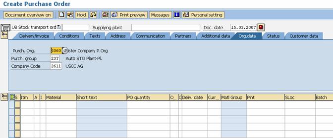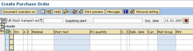 Ptr a crea un Purchase Order, introduceti tranzactia ME21N. Ecranul "Create Purchase Order" este afisat. Selectati "UB Stock transport order" ca tip de Purchase Order Type.