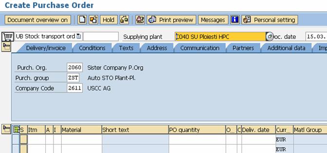 Selectati "UB Stock transport order" ca Purchase Order Type si introduceti supplying plant.