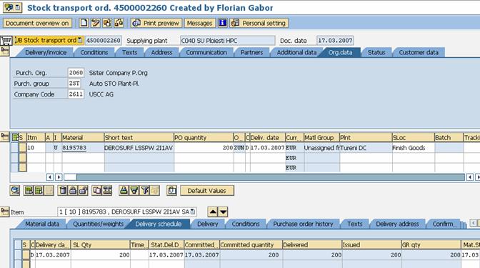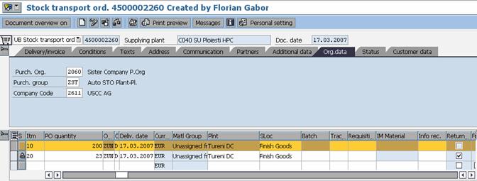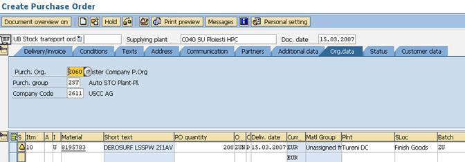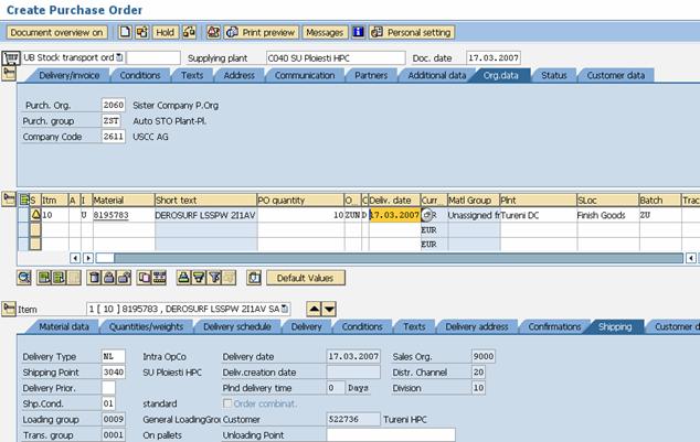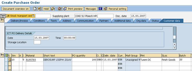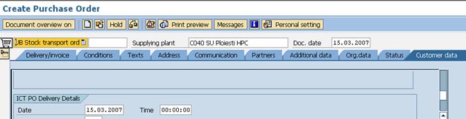 NOTA numai ptr HPC: Ptr HPC Stock Transfer Orders (UB), este necesar sa se completeze campul Delivery Date localizat in tabul "Customer Data" la nivelul de header al Purchase Order