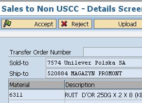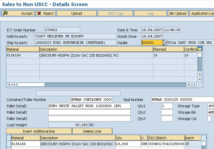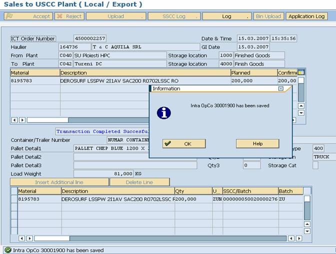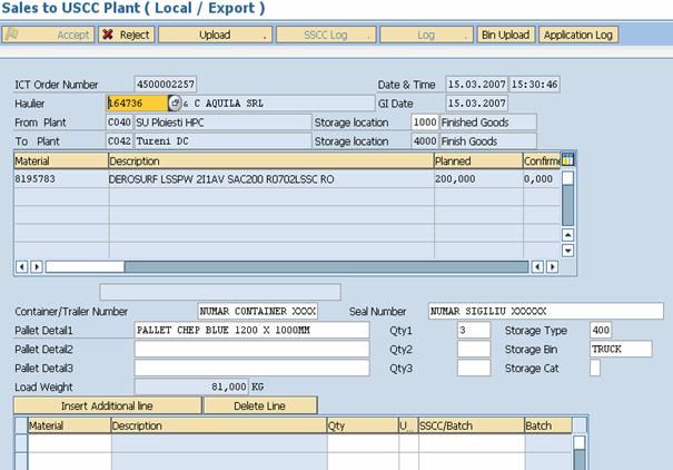 Sistemul va afisa ecranul "Sales to USCC Plant (Local / Export)". Detailiile aferente paletului selectat sunt afisate in partea de jos a ecranului.