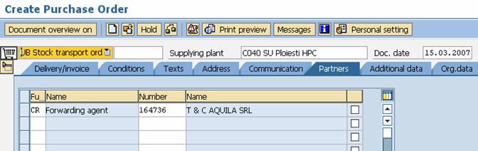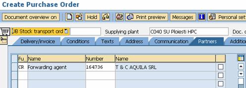 Deschideti tab-ul "Partners" . Introduceti CR Forwarding Agent , number (Haulier code ) si salvati Purchase Order.