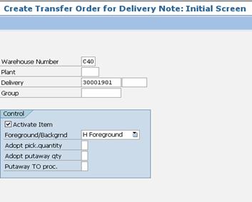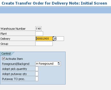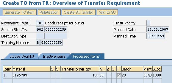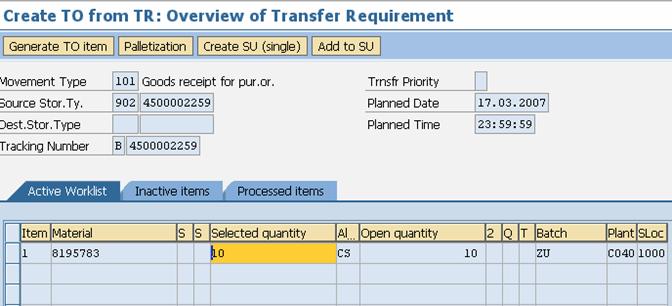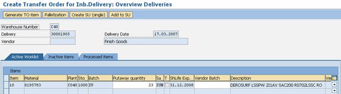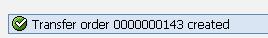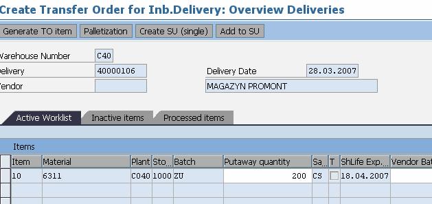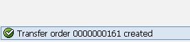 Introduceti tranzactia "LT03". Introduceti delivery number. Sistemul va afisa ecranul "Create Transfer Order for Inbound Delivery: Overview Deliveries" Click pe butonul "Generate TO item" si apoi Save. Astfel,WM TO este creata si confirmata.