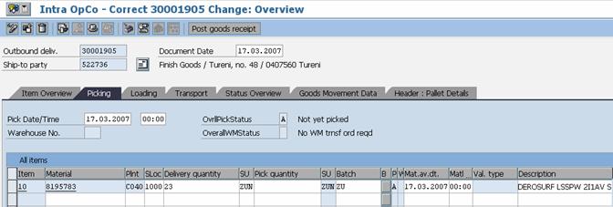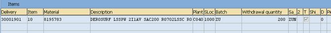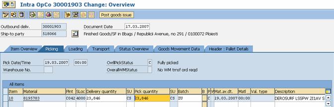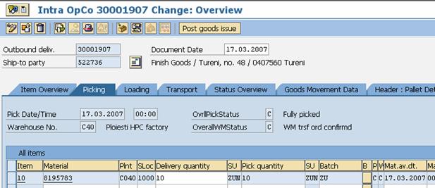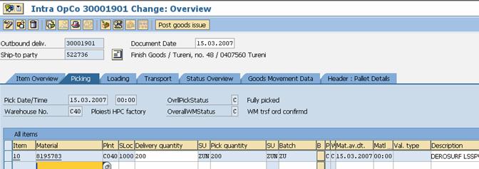 Sistemul va afisa un rand nou ce contine numarul afernt noului delivery creat, ( "SD Doc." Column)". Copiati delivery number ce va fi utilizat in pasul urmator.