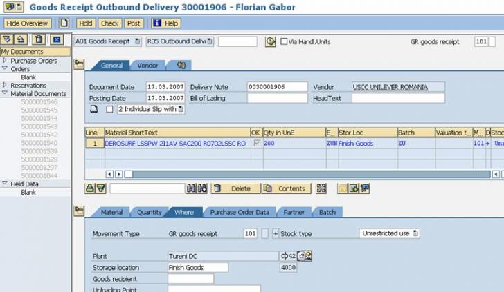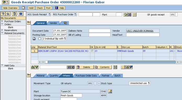 Click pe butonul"Post" ptr a inregistra Goods Receipt.