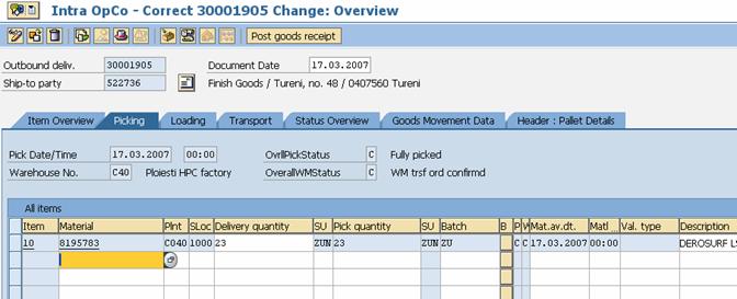Introduceti tranzactia VL02N. Introduceti delivery number si Execute. Sistemul va afisa detaliile ptr delivery in change mode. Click pe butonul "Post Goods Receipt" .