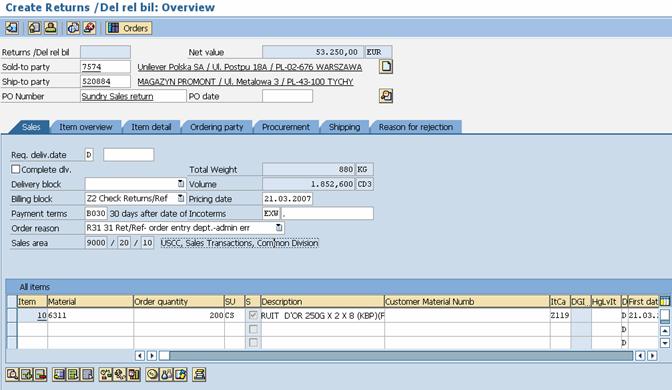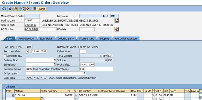 Introduceti sold-to, ship-to, numarul PO, material, quantity, batch, plant, unit si storage location (route ar trebui sa fie in mod automat determinata ). Introduceti order reason si inlaturati billing block. Salvati orderul.