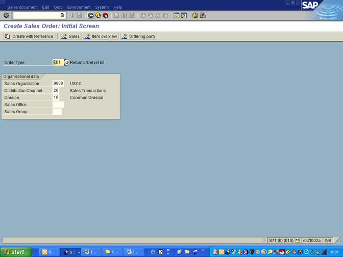 Sistem va afisa ecranul "Create Sales Order: Initial Screen". Introduceti Sales order type ZB1 in Sales area/Distrb chan/Division: 9000/20/10