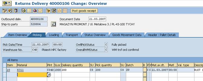 Introduceti numarul ptr delivery si verificati daca tipul movement type este 101.