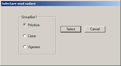 Daca din fereastra initiala a programului a fot selectat sistemul de criptare Polybios, se va putea exemplifica asest tip de criptare. Utilizatorul trebuie sa introduca textul ce vrea sa fie criptat cu acest sistem in primut textbox. Se pot introduce litere mari sau mici, dar cifrele sau alte semne nu vor fi permise. De asemenea utilizatorul nu poate introduce litera W, deoarece la proiectarea careului lui Polybius aceasta a fost eliminata, fiind litera cu frecventa de aparitie cea mai mica in limba romana.