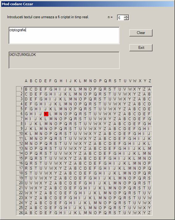 Pentru o mai buna intelegere a modului in care se realizeaza aceasta criptare in partea de jos a interfetei se poate observa pe un careu de 26X26 cum se obtine corespondenta intre litera ce urmeaza a fi cifrata si valoarea ei dupa criptare. In culoare rosie este reprezentata litera obtinuta dupa criptare, ce depinde de valoarea lui n si de litera din care provine.