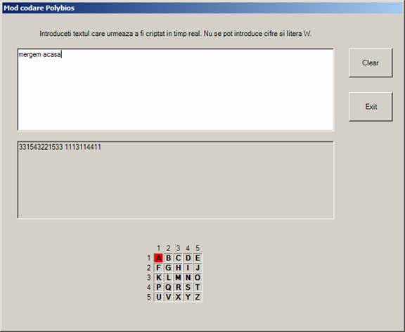 Pentru o mi usoara intelegere a acestui sistem de criptare, aplicatia contine o matrice de 5X5, numit careul lui Polybios, pe care se poate urmari modul in care se realizeaza criptarea.