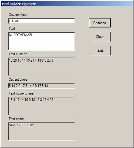 Pentru o mai usoara intelegere a acestui mod de criptre, s-au afisat si rezultate intermediare: valorile numerice (pozitiile) ale caracterelor din textul ce urmeaza a fi codat intr-un sir numerotat de la 0 la 25, valoare 0 fiind corespunzatoare pentru A si valoarea 25 fiind corespunzatoare lui Z ; valorile numerice pentru caracterele din cuvantul ales ca si cheie ce se obtin in acelasi mod descris mai sus ; valorile numerice ale caracterelor din textul cifrat inainte de transformarea lor in caractere propriu-zise.