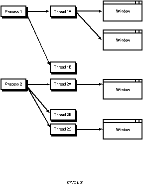 O fereastra este totdeauna "gestionata de" un fir; un fir poate fi proprietarul uneia sau mai multor ferestre sau pentru nici una. In final, ferestrele sunt într-o relatie ierarhica; unele sunt la nivelul cel mai de sus, altele sunt subordonate parintilor lor, sunt ferestre descendente.
