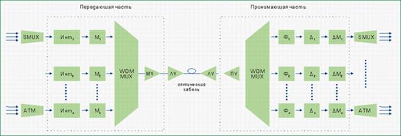 Sistemele WDM sint bazate pe capacitatea fibrei optice de a transmite concomitent lumina diferitor lungimi de unda (culori) fara interferenta reciproca . Fiecare lungime de unda prezinta in fibra optica un canal optic aparte . Exista diferite metode optice pentru a uni citeva canale intr-o singura fibra , iar pe urma de a le diviza in anumite puncte ale retelei . In prezent tehnologia WDM permite transmiterea printr-o singura fibra , canale cu diferenta lungimilor de unda de 1 nm, aceasta tehnologie are denumirea de DWDM (Dense WDM ) . Dezvoltarea tehnologiei WDM a permis de a crea retele in care prin fibre optice se transmit peste o suta de canale independente , si chiar retele in care transmisiunea informatiei se efectuiaza in ambele directii , in una si aceiasi fibra optica Aceste succese a tehnologiei WDM au fost atinse datorita amplificatoarelor pe fibra optica EDFA . Amplificatoare pe fibra optica dopate cu erbiu EDFA( Erbium Doped Fiber Amplifier ) . In aceste dispozitive pe baza energiei laserului de injectie se produce amplificarea tuturor canalelor care vin la intrare , lungimile de unda a carora se afla in banda lungimilor de unda 1530-1565 nm - banda de lucru a amplificatorului .