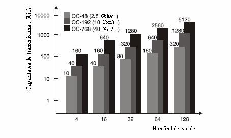 de timp intre elaborarea noilor tehnologii si introducerea lor in utilizare se micsoreazaFibrele optice a devenit anume acel mijloc de transmisiune , care a putut sa tina fata acestor fluxuri mari de informatie . La inceput pentru divizarea benzii de transmisiune a unei fibre in canalele de comlunicatii se utiliza multiplexarea in timp TDM ( Time Division Multiplexing ) . Dar din cauza ca dispozitivele de modulare si multiplexare deveneau mai complicate , cu cresterea vitezei de transmisiune a datelor , utilizarea acestei tehnologii a fost limitata . Cresterea benzii de transmisiune in continuare a impus necesitatea de utilizare a unei metode alternative - multiplexarea prin divizarea lungimii de unda ( Wavelength Division Multiplexing- WDM ) .