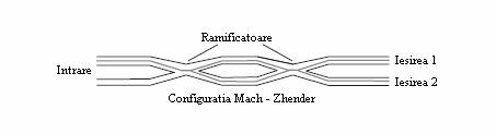 Cel mai simplu ramificator biconic FBT ( Fused Biconic Tapered ) reprezinta o pereche de fibre optice monomod , pe o anumita portiune sudate intre ele dupa lungime. Moda de baza a fibrei , care se propaga prin miezul fibrei optice , la trecerea prin regiunea sudata se transforma in mode ale invelisului . Cind fibrele se divizeaza din nou , modele invelisului se transforma in modele fibrei , care se propaga prin miezul fiecarei fibre de iesire . In rezultat se obtine un ramificator ,care practic nu introduce pierderi . Semnalele de iesire nu numaidecit trebuie sa aiba putere egala , raportul puterilor se determina de interferenta in regiunea de sudare a fibrelor si depind de lungimea acestei portiuni . Daca doua asa ramificatoare sint situate consecutiv ( fig. 2.16 ) si doua ramuri au drumuri optice diferite intre locurile sudate , atunci aceasta combinatie actioneaza ca un interferometru Mach-Zehnder . Puterea semnalului de iesire se divizeaza intre fibrele de iesire in dependenta de lungimea undei cu o anumita periodicitate . Daca semnalul de baza de iesire contine canale optice a doua unde diferite atunci la o anumita alegere a parametrilor aceste canale, se vor afla la iesire in fibre diferite . A doua fibra de iesire nu se utilizeaza .