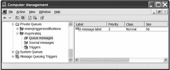 static voidAcest exemplu trimite un mesaj unei cozi private numita MyPrivateQ. Deoarece primul parametru a functiei Send este de tip obiect putem trimite orice instanta de clasa in corpul mesajului. In cazul de fata este trimis un string simplu. Figura de ma jos prezinta continutul cozii MyPrivateQ dupa ce codul a fost executat.
