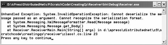 In ceea ce preiveste prima problema, si anume aceea a interpretarii corpului mesajului, .NET messaging ofera trei formatatori de mesaje care serializaza tipurile CLR in corpul mesajului : XmlMessageFormatter, BinaryMessageFormatter, si ActiveXMessageFormatter. Atunci cand trimitem un mesaj, formtatorul implicit este XmlMessageFormatter, astfel incat mesajele trimise in exemplele anterioare l-au folosit pe acesta. Cu toate acestea, atunci cand se receptioneaza un mesaj, trebuie sa se specifice in mod explicit formatatorul, asa cum se observa mai jos: