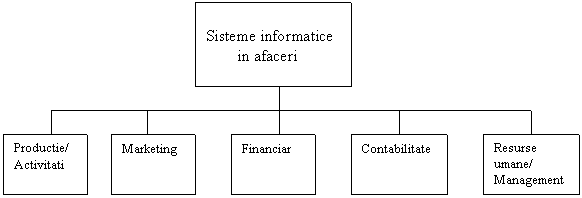 Sunt tot atat de multe cai de a utiliza sistemele informatice in afaceri cate tipuri de activitati care sunt desfasurate intr-o afacere, cate probleme de afaceri sunt rezolvate, si cate oportunitati de afaceri sunt urmarite. Un beneficiar al unei viitoare afaceri trebuie sa aiba o perspectiva generala asupra principalelor cai in care sistemele informatice ar putea fi folosite pentru a sprijini fiecare functie a afacerii. Sisteme informatice in afaceri este termenul care descrie o gama larga de sisteme informatice (TPS, rapoarte informatice, suport informatic pentru luarea deciziior, etc.) care sprijina o functie a afacerii precum: contabilitatea, sectorul financiar, marheting-ul, management-ul, si altele. Fiecare sistem informational utilizat va capata numele dupa functia pe care o sprijina adica sisteme financiare, sisteme mamageriale, etc. Un beneficiar al unei afaceri trebuie sa aiba perspectiva specifica asupra felului in care un sistem informatic infuenteaza o anumita functie a unei afaceri (ex.marketing), sau cum influenteaza acesta un anumit domeniu de afaceri (ex. domeniul bancar ). De exemplu cineva care isi propune isi construieste cariera in domeniul marketing-ului bancar trebuie sa aiba cunostinte de baza referitoare la cum se utilizeaza sistemele informatice in domeniul bancar si cum sprijina ele activitatile de marketing in banci sau alte firme. In figura urmatoare sunt ilustrate sistemele informatice asa cum pot fi ele grupate dupa functia de afaceri pe care o sprijina.
