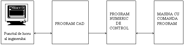 Proiectarea asistata de calculator (CAD) Sistemele informatice CAD ajuta pe langa proiectarea produselor la simularea, analiza si evaluarea performantelor produsului, dar si a calitatii acestuia, in plus la sfarsitul operatiei de proiectare poate sa ofere necesarul de materiale pentru producerea respectivului produs. Aceste sisteme se compun dintr-o statie de lucru dotata cu soft si hard specializate avand puternice facilitati grafice. Intoducerea datelor se poate face cu ajutorul dispozitivelor de intrare (creion, joystick, tastatura) iar datele de iesire se pot vizualiza pe monitor in doua sau trei dimensiuni avand posibilitati de rotire si vizualizare a tuturor fetelor obiectului proiectat, de vizualizarea doar a unei anumite parti, avand chiar si posibilitatea de a face ca partile componente sa se miste ca si cum produsul ar executa operatia pentru care este destinat. Acest proiect poate fi finalizat intr-un model matematic al produsului, care sta la baza specificatiilor unei masini cu comanda program.
