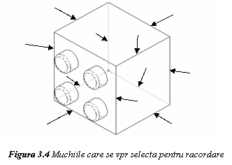 Se vor selecta muchiile indicate în figura 3.4 si se vor rotunji cu o raza de 1mm. Pentru ca toate muchiile sa fie vizibile dar imaginea sa nu fie prea încarcata, se va alege vederea cu muchiile ascunse colorate în gri. Sagetile indica muchiile care vor fi rotunjite.