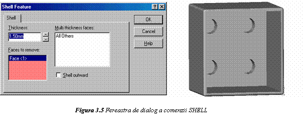 Softul SolidWorks permite construirea unor cavitati prin scobirea continutului unui obiect solid. Comanda care realizeaza acest lucru se numeste SHELL , shell, însemnând în limba engleza învelis, carcasa. Practic, se creaza o cavitate, o scobitura într-o piesa, pastrându-se suprafata selectata deschisa si acordând pereti de o grosime stabilita celorlalte fete (grosimea tuturor peretilor exteriori sau interiori, indiferent de forma lor va fi aceeasi). Comanda se utilizeaza în special pentru proiectarea produselor care se realizeaza prin turnare sau ambutisare.