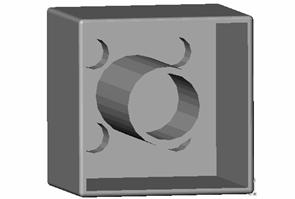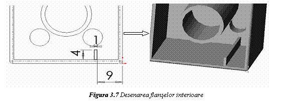 Crearea blocului de constructie de baza pleaca de la schita unui patrat cu latura de 40mm care se extrudeaza pe o înaltime de 35mm. În continuare, se selecteaza vederea frontala si se deseneaza pe planul acesteia un cerc cu raza de 5mm, plasat fata de muchii conform exemplului din figura 3.2. Cercul desenat se extrudeaza pe o înaltime de 6mm.